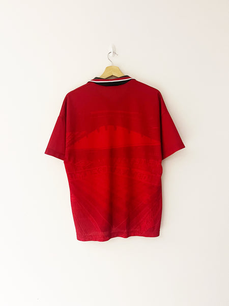 INFO - Home shirt as worn as Man Utd won the ‘95/96 Premier League, pipping Newcastle to the title by 4 points. Players in the squad included Cantona, Keane, Irwin, McClair, Pallister, Ince